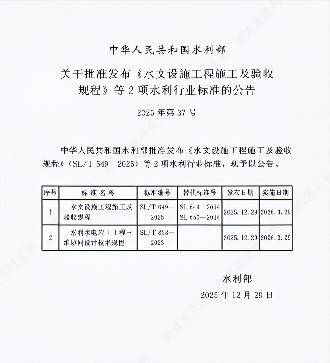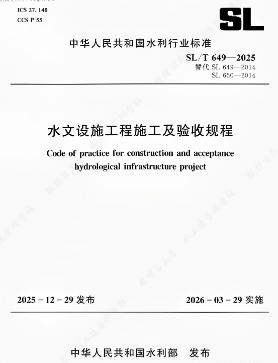《水文设施工程施工及验收规程》(SL/T 649-2025)将于2026年3月29日起正式施行,全面替代SL 649-2014和SL 650-2014。