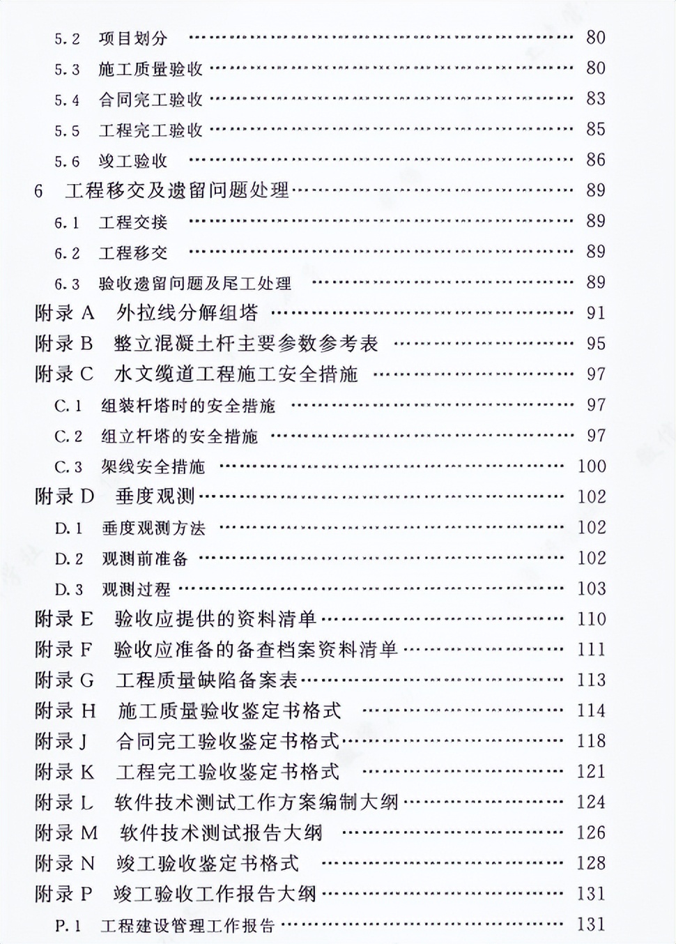例如,详细列出了水文缆道铁塔组立、缆索架设、垂度观测的施工方法和安全措施(附录C)。